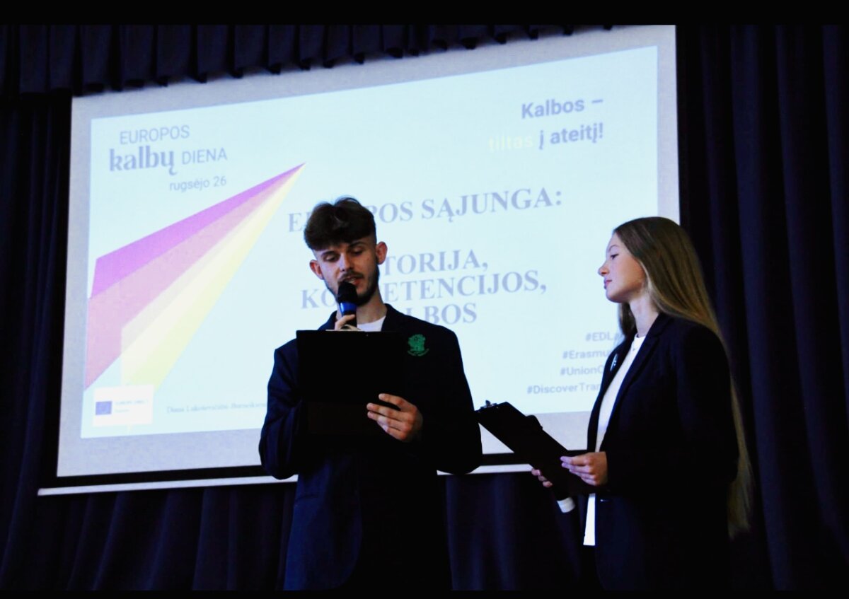 Pagrindinį pranešimą skaitė Kauno „Europe Direct“ centro vadovė Diana Lukoševičiūtė-Burneikienė: pristatė Europos Sąjungos istoriją, jos kompetencijas ir daugiakalbystės svarbą. Lektorė pabrėžė, kad kalbinė įvairovė ir pilietiškumas – Europos vertybių pamatas, o ES institucijose kiekviena kalba turi vienodą statusą. Pasak lektorės, kalbų mokėjimas – tai ne tik praktinis įgūdis, bet ir priemonė suprasti kitus, plėsti akiratį bei stiprinti europietišką tapatybę.