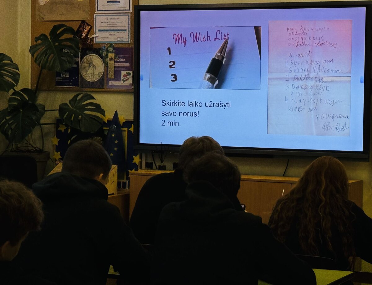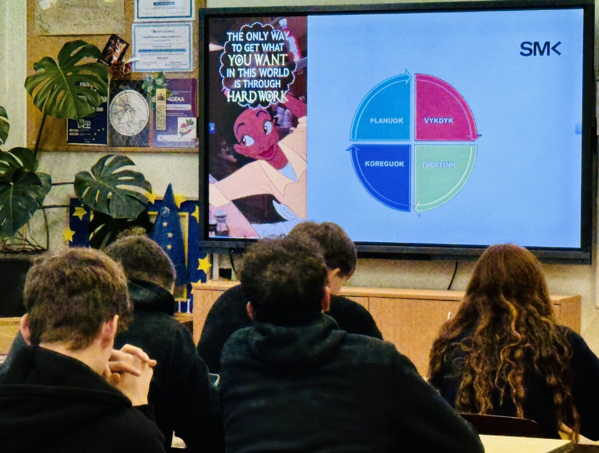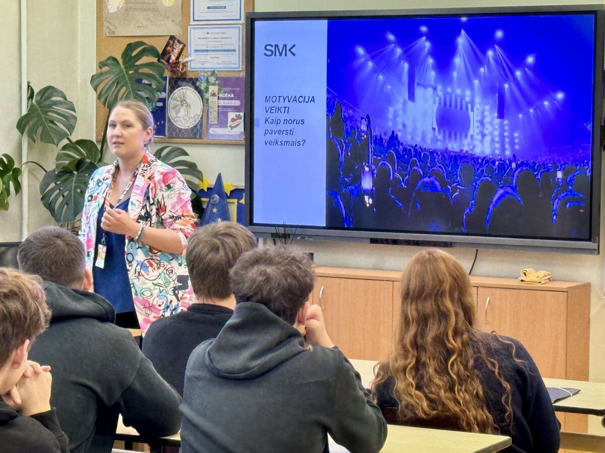 Lapkričio 10-ąją gimnazijoje lankėsi SMK aukštosios mokyklos dėstytoja ir projektų vadovė Ona Peičiūtė. Susitikime su III a ir III d klasių gimnazistais dėstytoja kalbėjo apie motyvaciją ir vidinius žmogaus resursus. Lektorė akcentavo: daugelis norų lieka neįgyvendinti todėl, kad pritrūksta aiškaus plano, pasitikėjimo savimi ir drąsos pradėti. Gimnazistai buvo pakviesti įsivertinti savo svajones, mintyse patikrinti, kas juos labiausiai įkvepia, o kas – stabdo. Viena iš pateiktų užduočių: norų vizualizavimas ir jų suskirstymas pagal laikotarpius: nuo dešimties metų perspektyvos iki veiksmų, kuriuos galima atlikti jau šiandien. Tai padėjo mokiniams suprasti, kaip svarbu tikslus suskaidyti į mažus, realiai įgyvendinamus žingsnius. Dėstytoja pabrėžė – planuoti verta tik tai, kas priklauso nuo paties žmogaus, nes sėkmė prasideda būtent nuo asmeninės atsakomybės. Aktyviausieji buvo paskatinami įvairiomis dovanėlėmis. Gimnazistai taip pat analizavo, dėl kokių priežasčių idėjos dažnai „užstringa“ ir neperauga į realų veiksmą. Buvo kalbėta apie baimę suklysti, aplinkinių nuomonės įtaką, per didelius lūkesčius sau ir nuolatinį atidėliojimą. Diskusijos metu buvo akcentuota, kad svarbiausia – nebijoti pradėti, o klaidos yra natūrali mokymosi proceso dalis. Dėstytoja dalijosi istorijomis apie jaunus žmones, kurie išdrįso kurti, bandyti ir nepasiduoti – ir šiandien yra savo sričių profesionalai.