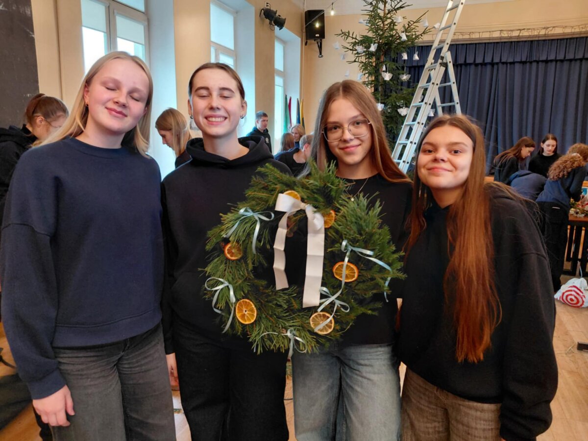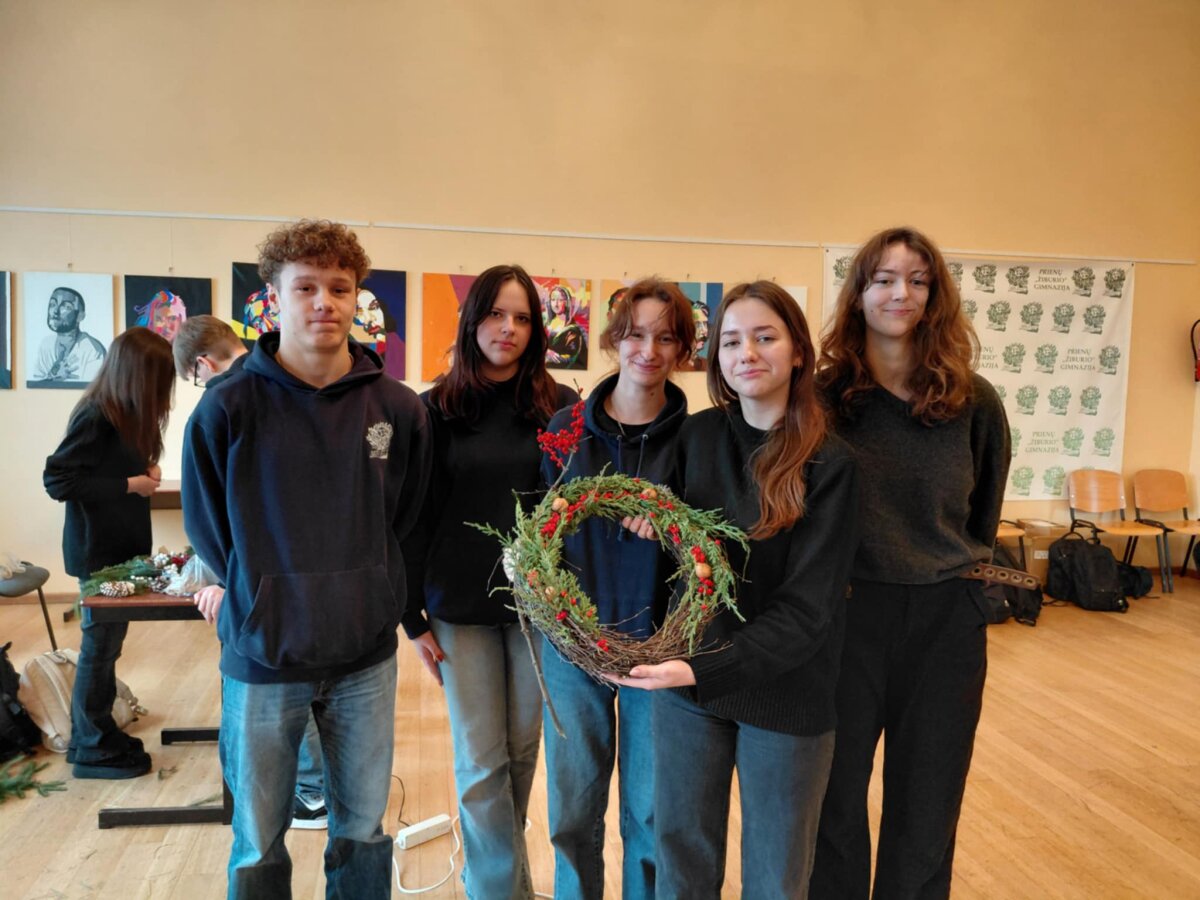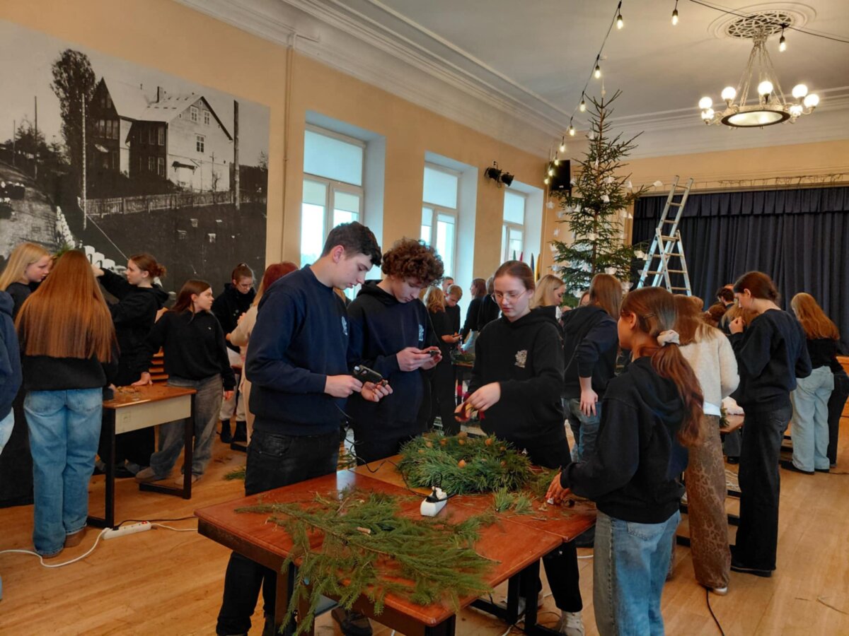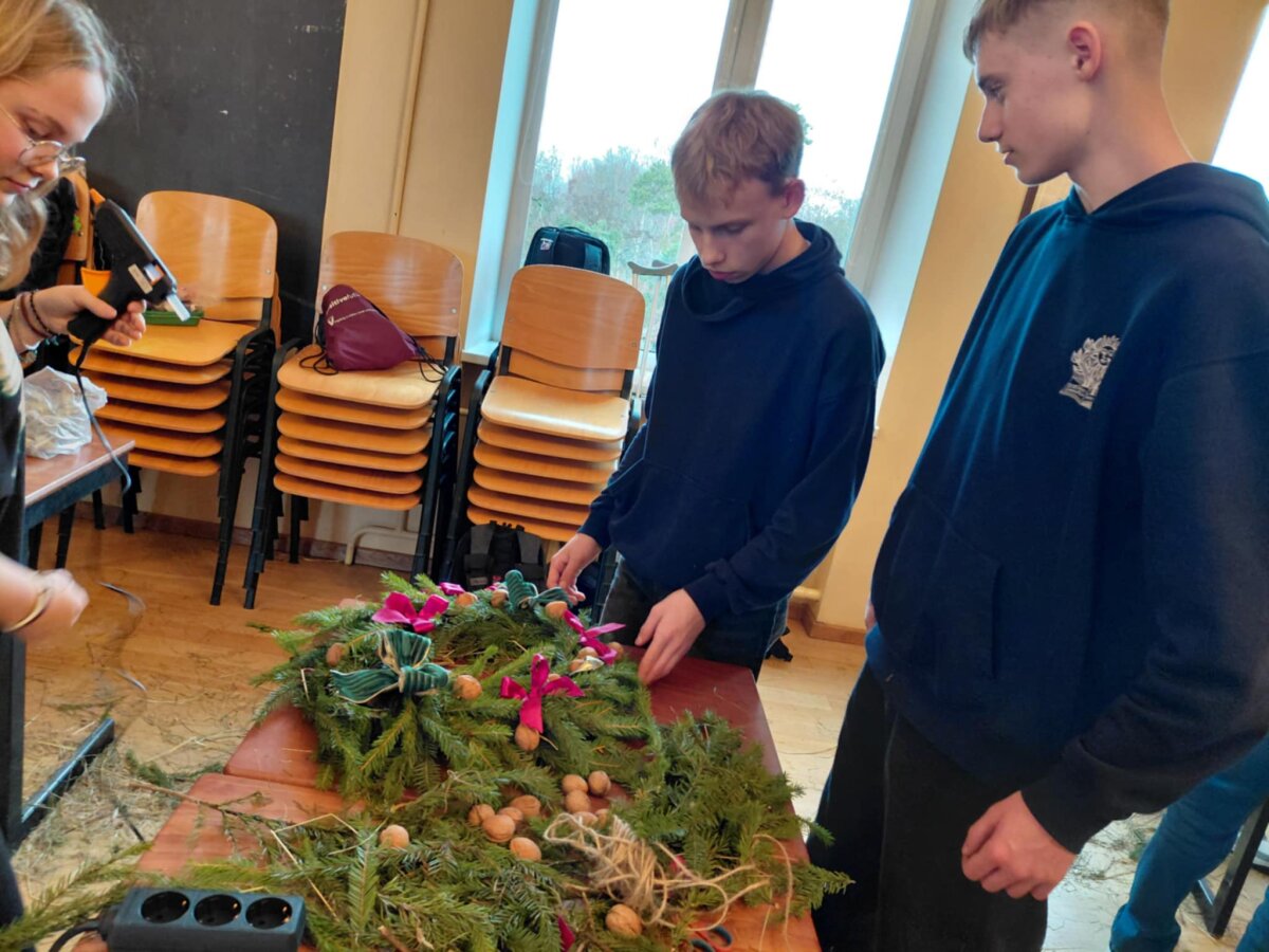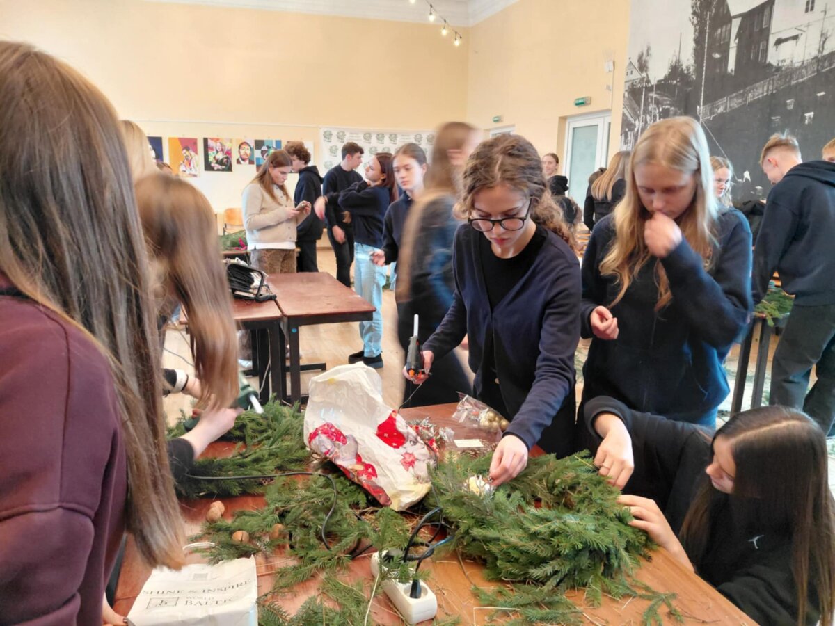 Gruodžio 1 dieną visų klasių mokiniai, nešini papuošimais, skubėjo į Aktų salę pinti vainiko, kuriuo vėliau papuošė savo kabinetą. Smagiai ir kruopščiai mokiniai dirbo, kol nupynė gražiausius ir puošniausius vainikėlius. Džiugu, kad jiems talkino ir Tėvų tarybos atstovės – mamytės: Jūratė Mitkevičienė, Akvilė Sadauskienė, Sandra Gegužinskė. Jų nupintas Advento vainikas papuošė Mokytojų kambarį. Dėkojame visoms mamytėms, TT pirmininkei Jurgitai Suchockienei už iniciatyvą, kūrybiškumą ir bendruomeniškumą, o mokiniams – už originalias idėjas ir jų įgyvendinimą. Smagi bendra veikla dar kartą įrodė, kad tradicijų tęstinumas yra gyvas ir svarbus gimnazijos bendruomenei.