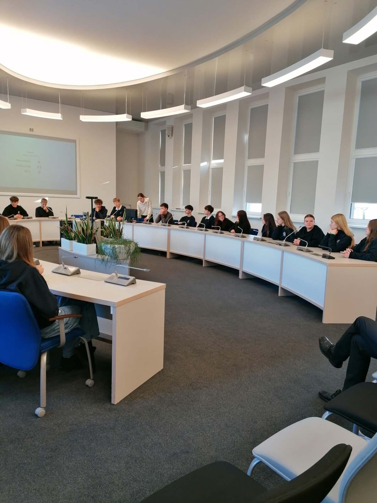 Vėliau mokiniai pamoką pratęsė savivaldybės tarybos posėdžių salėje. Šią pamokos dalį vedė mero patarėja Viktorija Ignatavičienė ir Tarybos sekretorė Birutė Žvirblienė, pamoką stebėjo Švietimo ir sporto skyriaus vedėjas Rimvydas Zailskas. Gimnazistai tarybos narių darbo vietose imitavo tarybos posėdį. Pirmiausiai jie siūlė klausimus, kuriuos reikėtų svarstyti posėdyje. Buvo pasiūlyta net 15 pačių įvairiausių klausimų: ar reikia grįžti prie penkiabalės sistemos, ar reikalingi tarpiniai egzaminai, ar pamokas reikia pradėti nuo 9 val., ar reikalinga Prienams LIDL parduotuvė? Patvirtinus dienotvarkę, vyko balsavimas: kiekvienas mokinys galėjo spausti mygtuką „už“, „prieš“ arba „susilaikyti“. Mokiniams ši procedūra labai patiko.