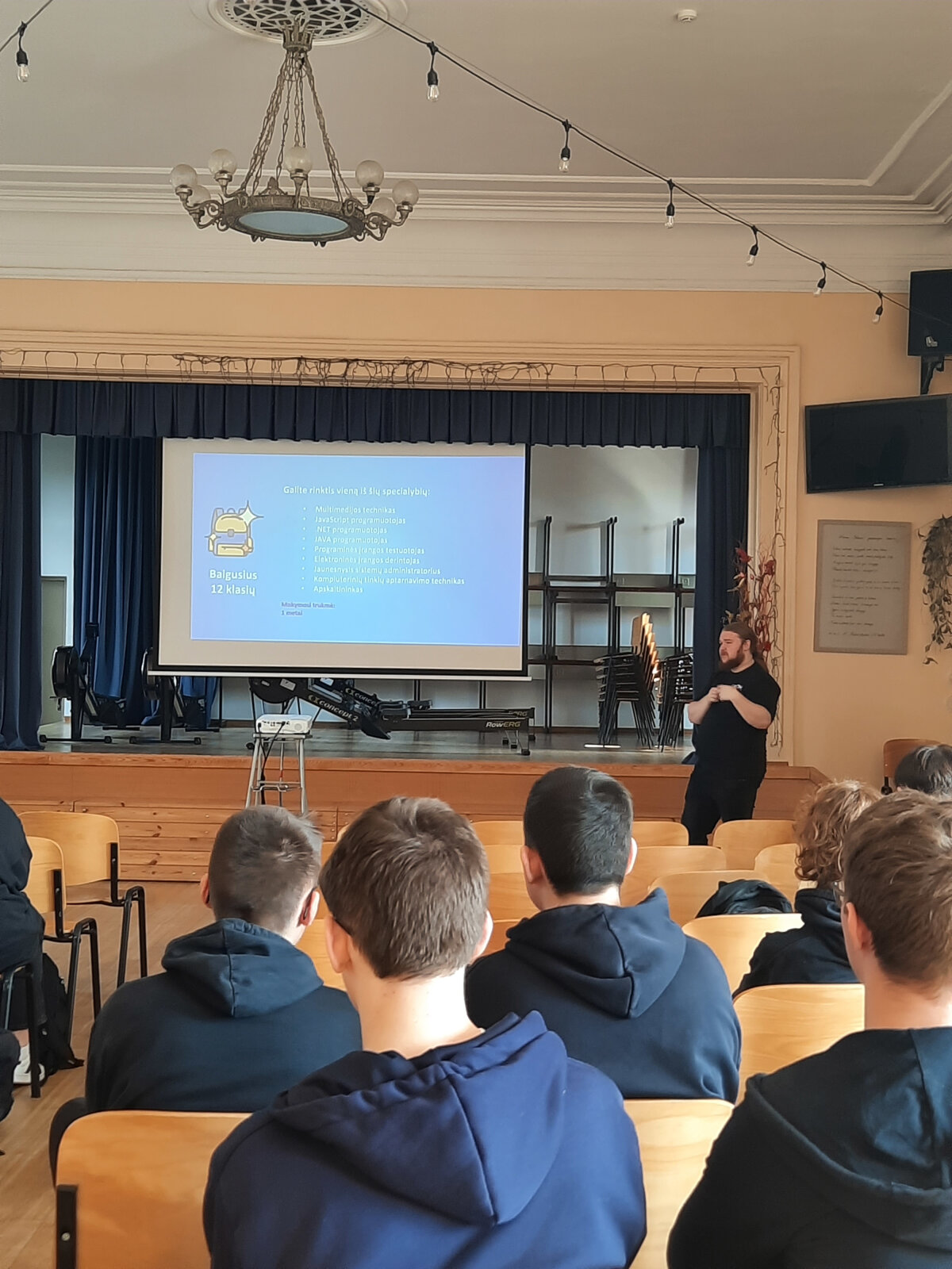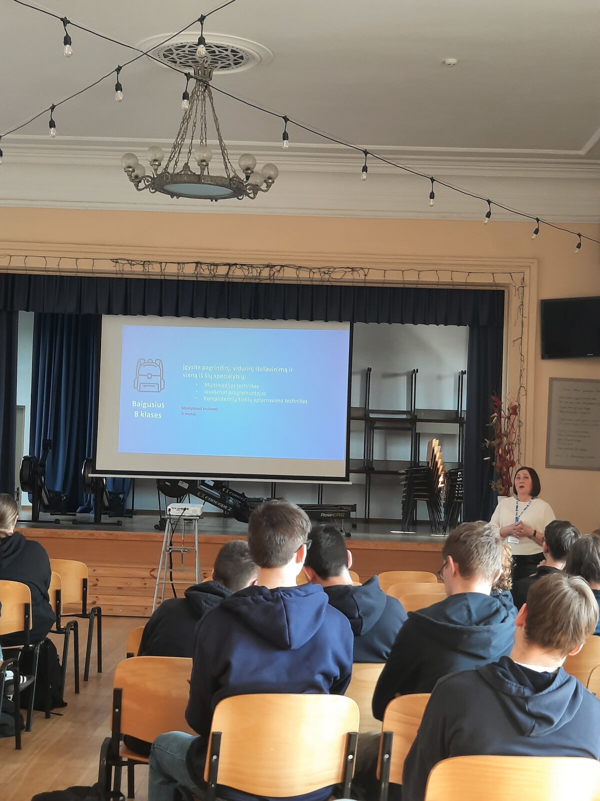 Kovo 31 dieną II–IV klasių gimnazistai susitiko su Kauno informacinių technologijų mokyklos atstovais ir išgirdo naujausią informaciją apie šiuolaikinių technologijų svarbą. Robertas Markevičius, programavimo mokytojas, kvietė mokinius pasirinkti savo kelią su KITM. Mokytojas patikino, kad KITM mokiniai gauna stiprų teorinių žinių pagrindą, daug valandų (70 procentų) praleidžia praktikoje. Jis pabrėžė, kad mokiniai turi galimybę lavinti praktinius įgūdžius multimedijos, kompiuterinių tinklų, programavimo, mobiliosios elektronikos taisymo, programinės įrangos testavimo, sistemų administravimo ir kitose programose.