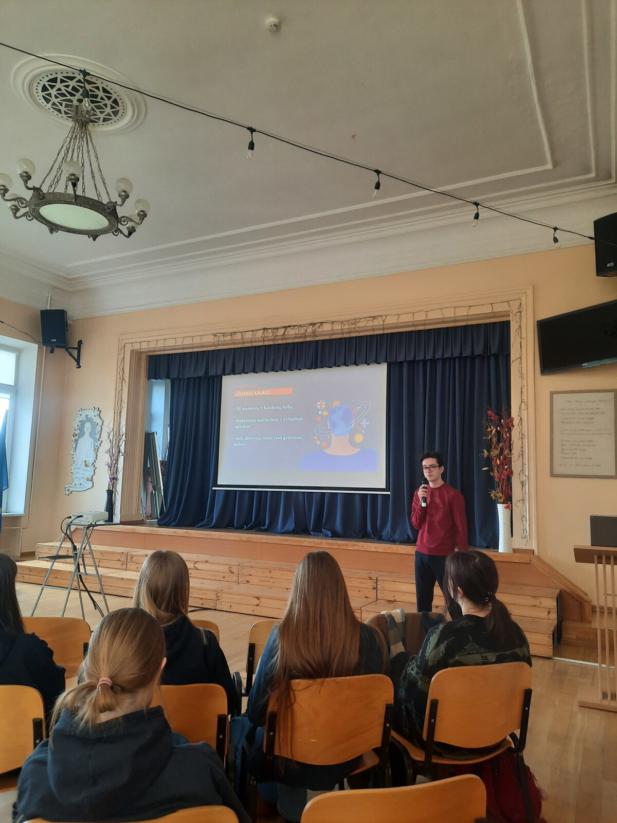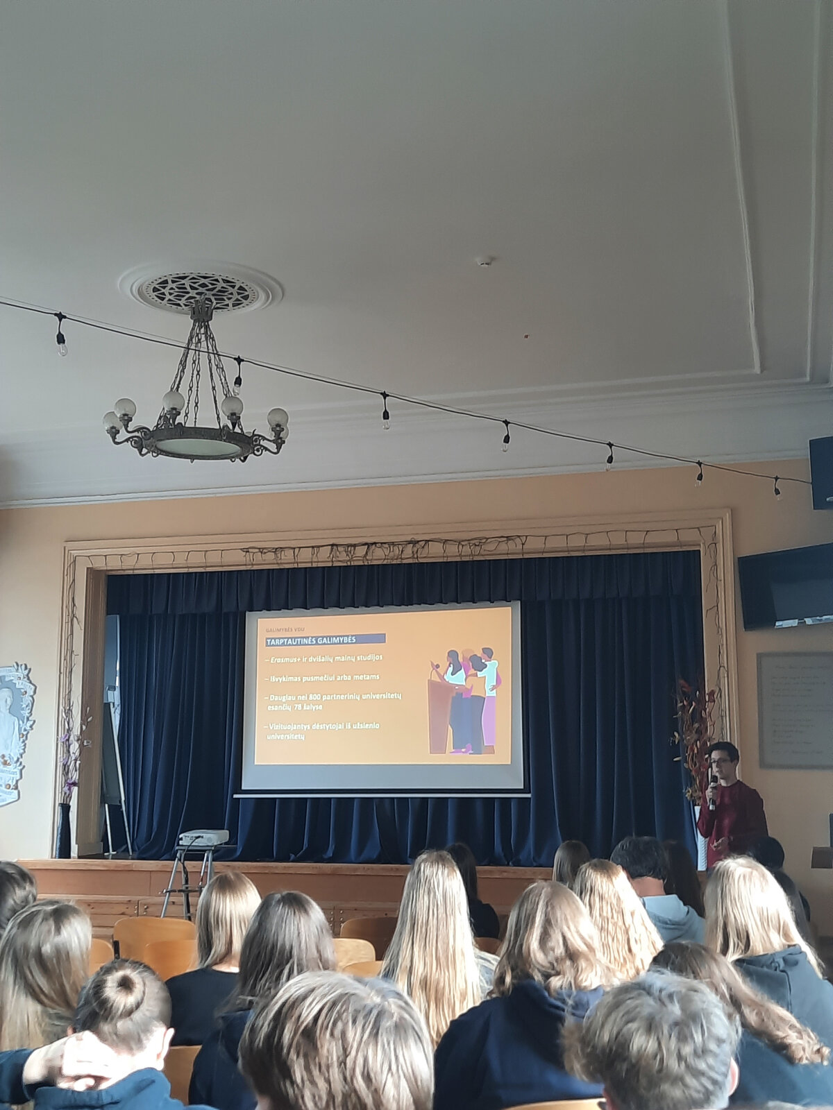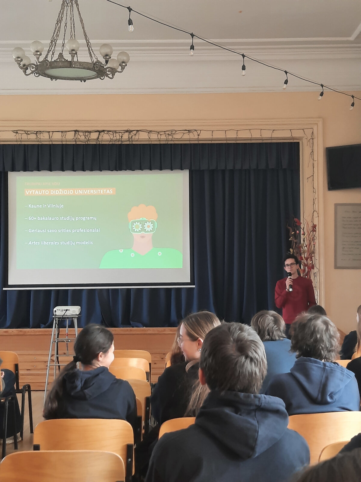 Kovo 17 dieną I–V klasių mokiniams klasės valandėlė vyko aktų salėje. VDU ambasadorius mokykloms pristatė VDU fakultetus, aptarė 2025 metų stojimų reikalavimus bei universiteto teikiamas galimybes.