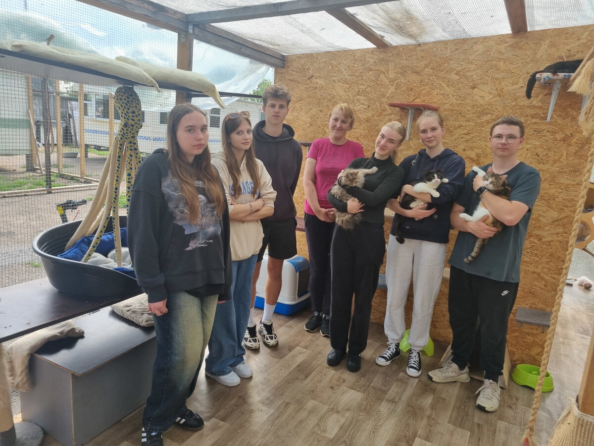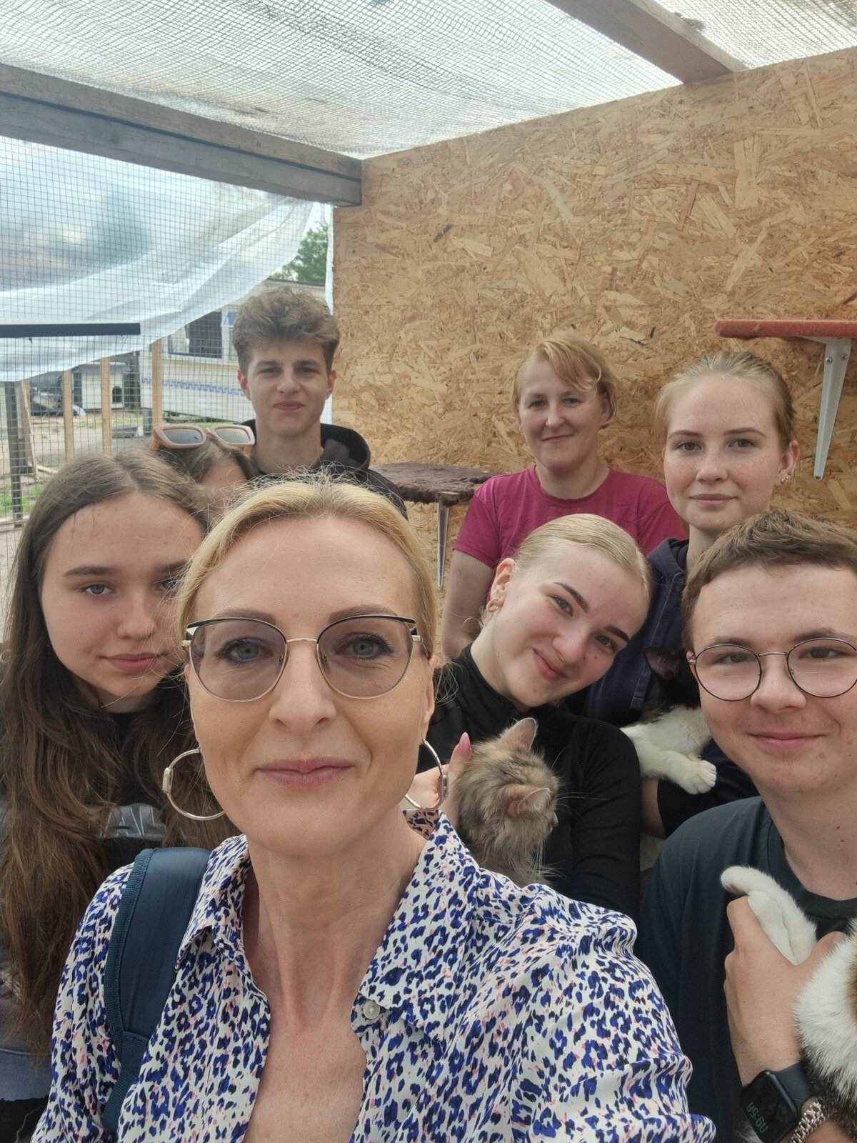 Kačių prieglaudoje „Airos katinėliai“, įsikūrusioje prieš ketverius metus, gimnazistus pasitiko prieglaudos savininkė Aira Beržinskienė. Nors įsikūrėme tik prieš ketverius metus, kalbėjo šeimininkė, bet jau turime kuo pasidžiaugti. Per metus priglaudžiama kelis šimtus pasimetusių, sergančių, nuskriaustų mielų katinėlių ir stengiamasi surasti katinėliams naujus namus. Ši veikla, anot šeimininkės, reikalauja daug meilės gyvūnams, laiko ir pastangų juos prižiūrėti. Tai puikiausia vieta savanoriauti ir prisidėti prie gyvūnų priežiūros bei pagalbos. Į kačių prieglaudą mokinius palydėjo anglų kalbos vyr. mokytoja Jurgita Barkauskienė.
