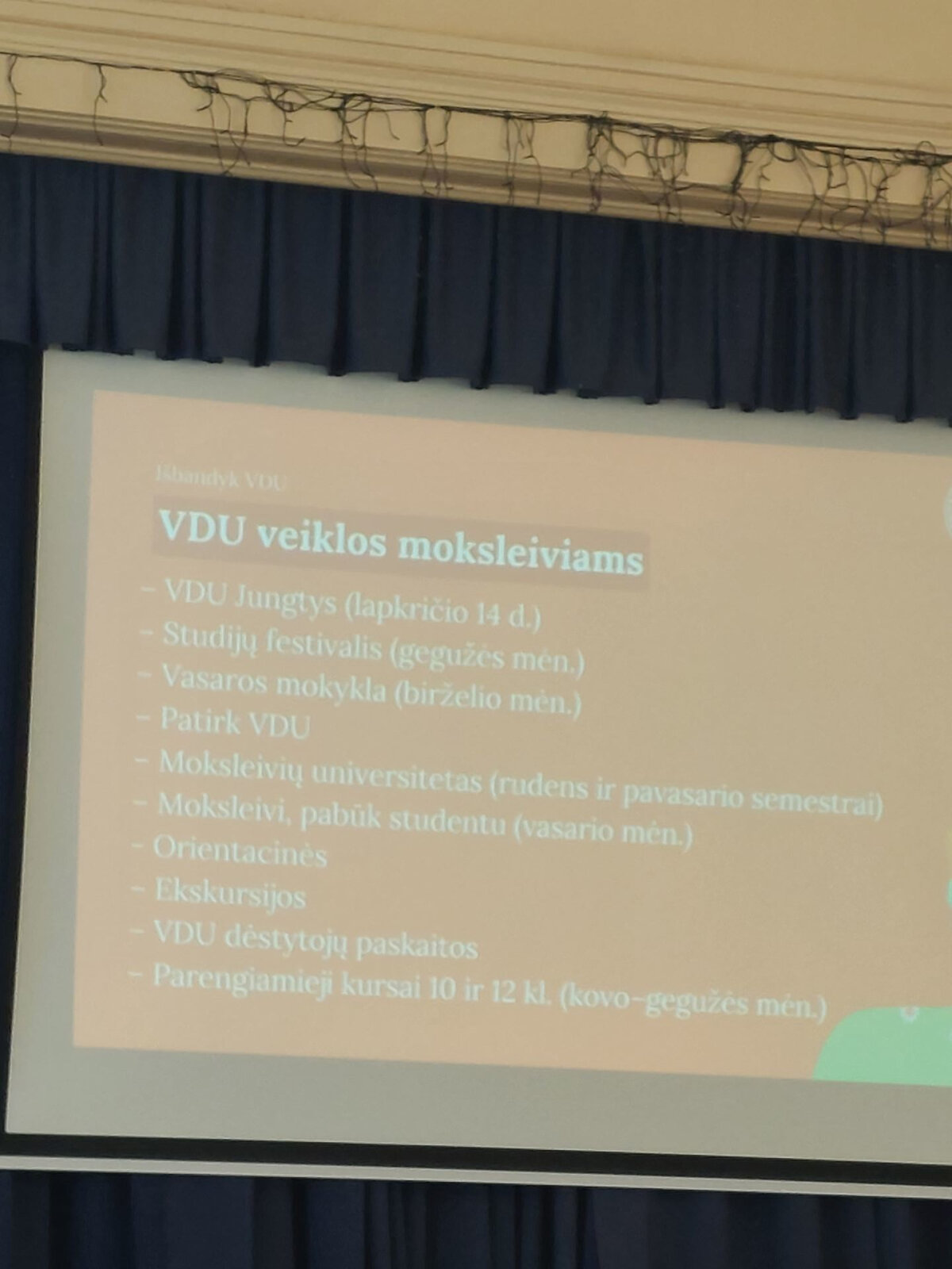 Spalio 20 dieną antrų ir ketvirtų klasių gimnazistai susitiko su Laurynu Samajausku, VDU Marketingo ir komunikacijos departamento specialistu. Svečias pristatė mokiniams Vytauto Didžiojo universiteto studijų programas: jos apima net vienuolika krypčių skirtingų mokslų.