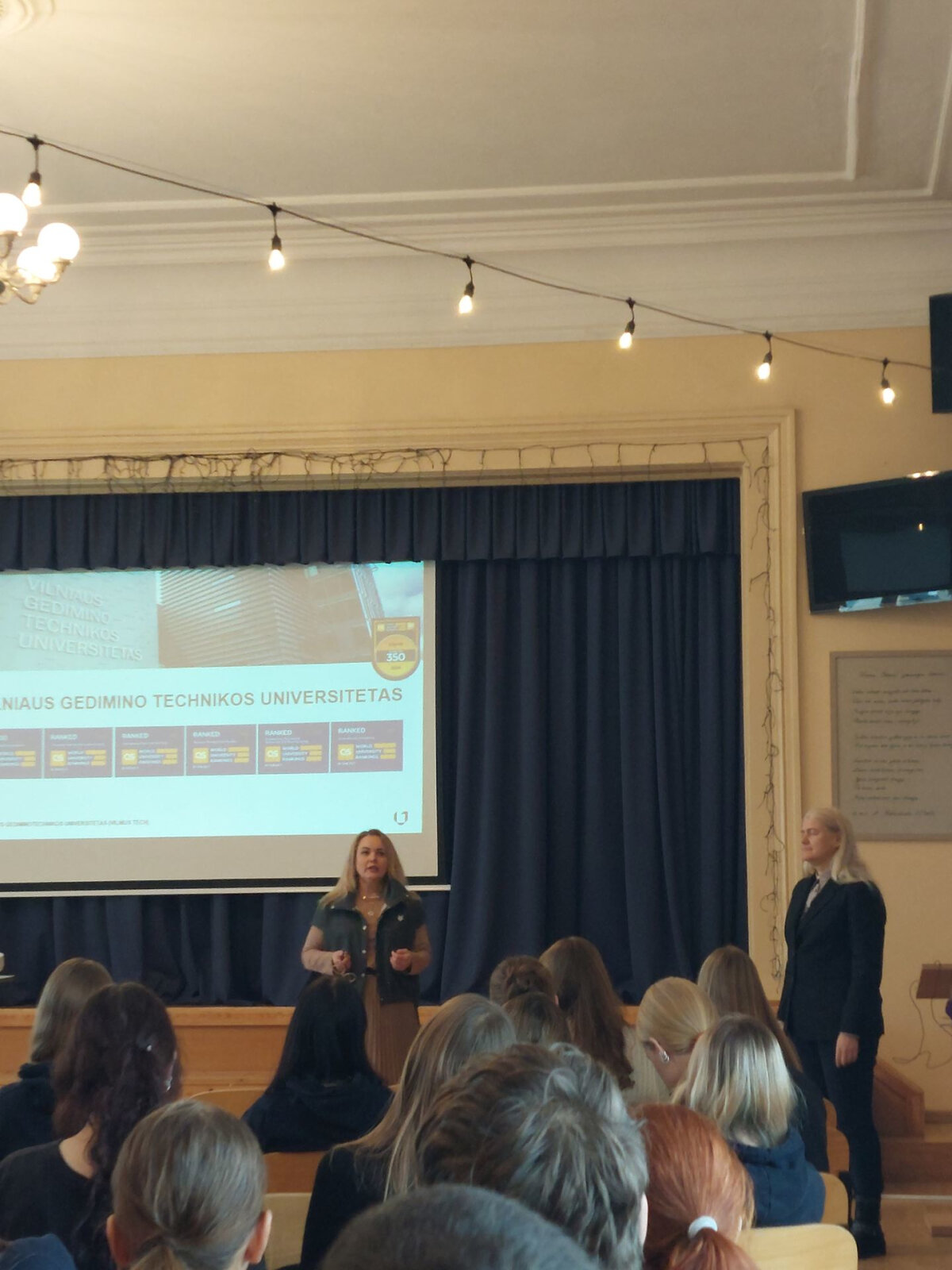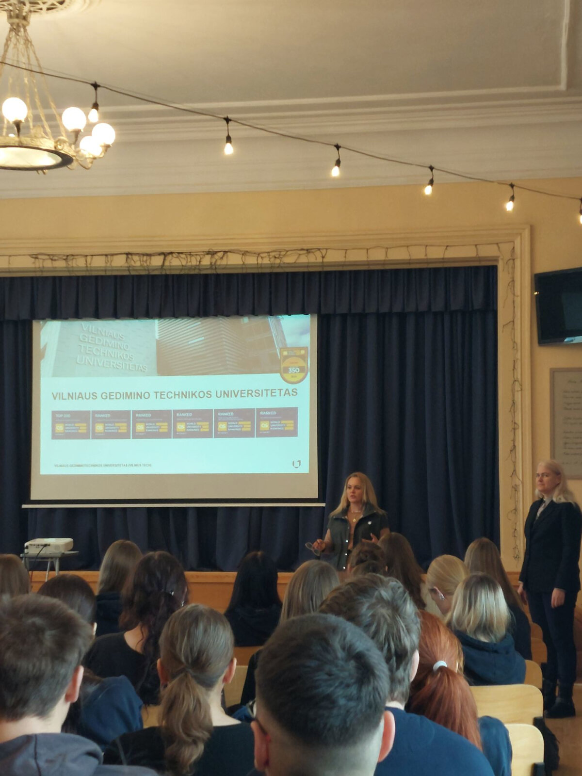 Sausio 7 dieną ketvirtų gimnazijos klasių mokiniai susitiko su VILNIUS TECH Verslo vadybos fakulteto prof. Aurelija Burinskiene ir doc. Olga Lingaitiene. VILNIUS TECH – vienas iš moderniausių Lietuvos universitetų, inovatyvus technologijos mokslų srityje ir suteikiantis į darbo rinką orientuotas studijas. Docentė pristatė vienuolika fakultetų bei juose vykdomų bakalauro ir vientisųjų studijų programas.