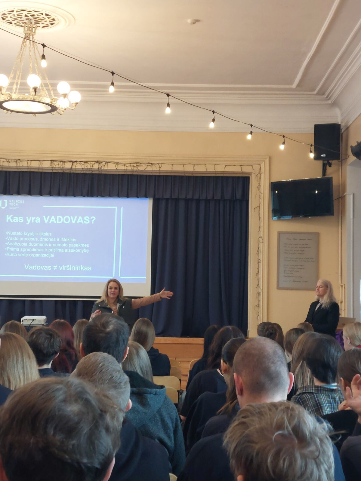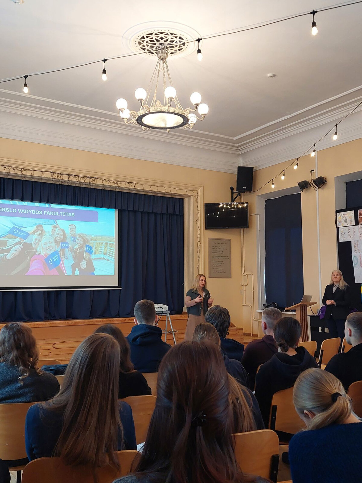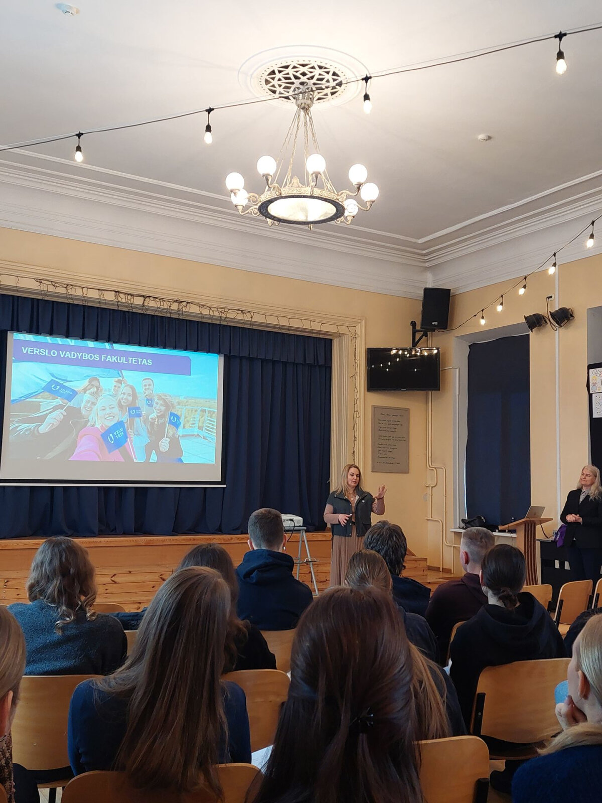 Lektorės papasakojo apie Verslo ir vadybos fakulteto studijų programas, priėmimą į universitetą, priminė išankstinio priėmimo į bakalauro studijas sąlygas. Docentė Olga Lingaitiene kalbėjo ir apie dvigubo diplomo studijas: universitetas suteikia galimybę norintiems studijuoti Lietuvoje dalį studijų laiko skirti kitos šalies aukštojoje mokykloje ir baigiant gauti dviejų aukštųjų mokyklų diplomus. Docentės nuomone, viskas – ką mes turime, kuo mes apsirengę, kuo mes naudojamės – neatsiranda be verslo vadybos ir logistikos. Profesorė Aurelija Burinskiene, tęsdama kolegės mintis, pabrėžė, jog kokybiško savalaikio ir teisingo paskirstymo išmokstama studijuojant organizacijų strategiją ir lyderystę. Susitikimo pabaigoje gimnazistai padėkojo lektorėms už išsamų pristatymą, informaciją apie studijų programas ir mokymosi galimybes.