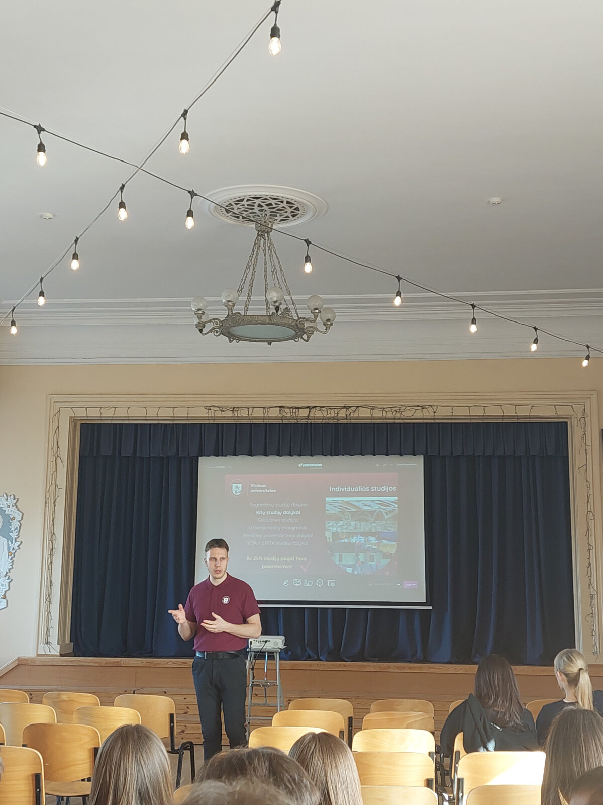 Kovo 9 dieną gimnazistai, besidomintys VU studijų programomis, susitiko su Vilniaus universiteto ryšių su mokyklomis koordinatoriumi Evaldu Matijošaičiu. Lektorius interaktyvaus susitikimo metu papasakojo apie Vilniaus universiteto išskirtinumus, pristatė studijų programas.